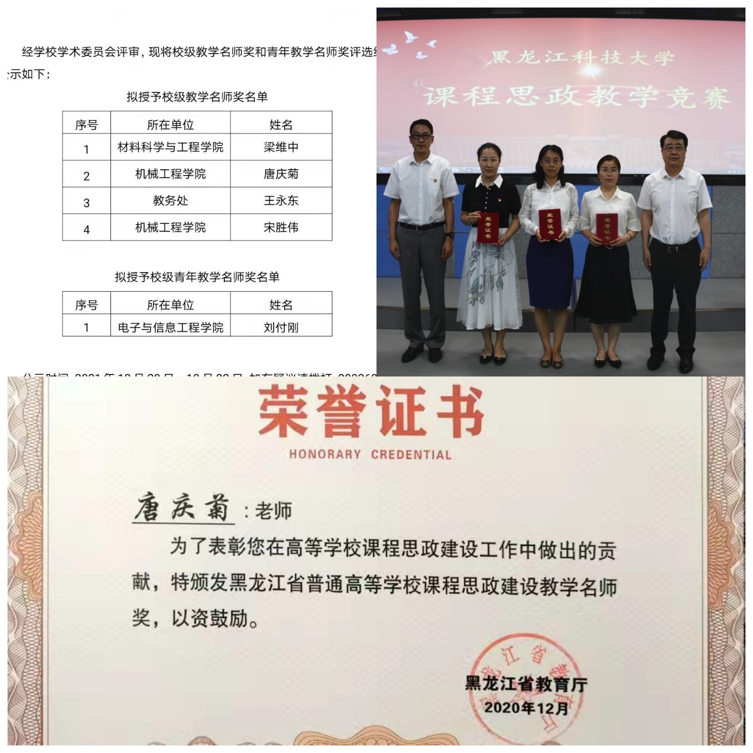 在5月举行的黑龙江省第十二届教学名师奖评选中,唐庆菊荣获“黑龙江省青年教学名师”,还于12月获评“校教学名师”;宋胜伟于12月获评“校教学名师”。