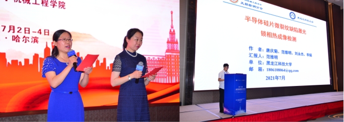 大会报告阶段及颁奖环节,副经理唐庆菊教授与分别来自哈尔滨工业大学、华中科技大学、电子科技大学、北京睿光科技有限公司的4位专家共同担任主持。公司研究生范维明做了题为“半导体硅片微裂纹缺陷激光锁相热成像检测”的学术报告。