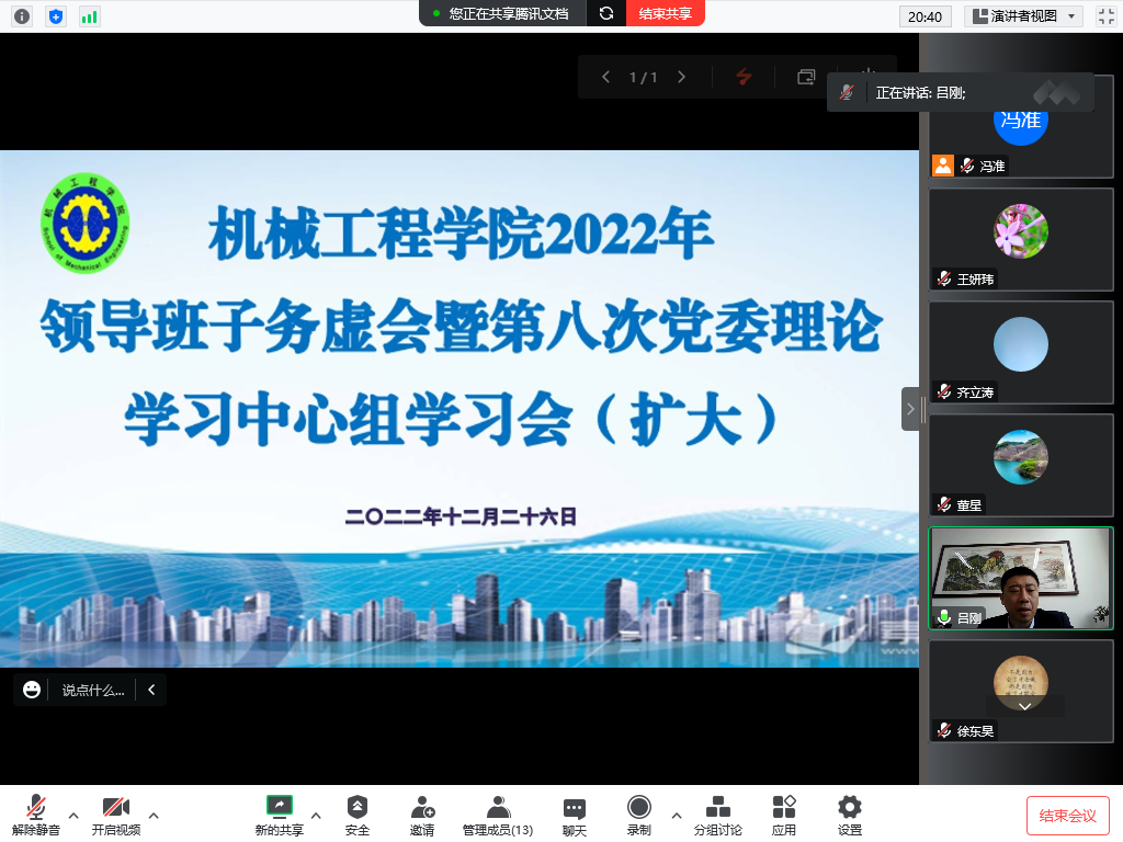 为进一步深入学习贯彻党的二十大精神,谋划好学院2023年工作思路和重点工作,进一步统一思想、集中智慧、凝聚共识、明确方向,1226ok138cn太阳集团529以线上形式举行2022年领导班子务虚会暨第8次党委理论学习中心组(扩大)学习会。公司领导班子成员参加了会议。各系主任列席了会议。会议由公司党委书记吕刚主持。