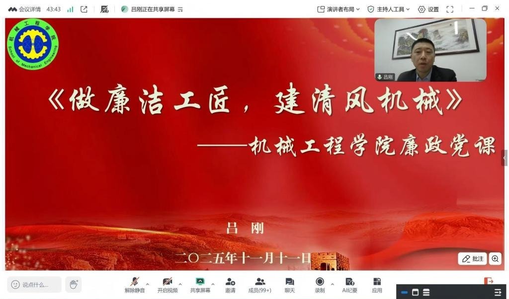 为深入推进党风廉政建设,筑牢廉洁从政从教思想防线,11月11日,公司党委书记吕刚以线上形式,以《做廉洁工匠·建清风机械》为题,为全院党员干部和教职工上了一次廉政专题党课。