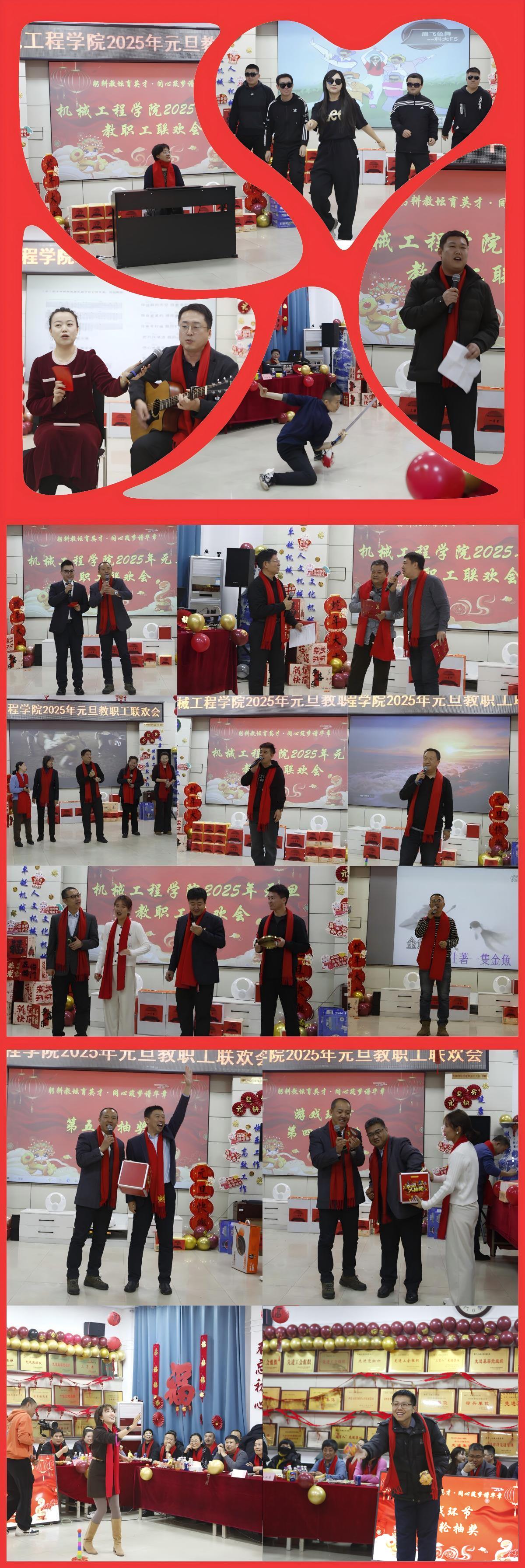 联欢会上,平日里与工图为伴、笔墨为友、书海为邻的老师们经过精心准备,化身为娱乐达人,先后表演了节奏欢快的现代舞《眉飞色舞》,优美动听的钢琴曲《The First Snowflakes》,寓意深刻的语言节目《古语新说》,幽默搞笑的相声《说说机械人》,独具民族特色的剑术表演,诙谐风趣的三句半《欢歌雅趣迎新年》,饱含深情的演唱《爱拼才会赢》《千千阙歌》《突然的自我》《朋友》《一条路》《木鱼和金鱼》等节目。老师们各怀绝技,才华横溢,纷纷登台亮相,展现了别样风采。独具匠心的游戏和抽奖环节更是嗨爆全场,热情高涨的掌声和喝彩声连绵不断,会场内热闹喜庆。