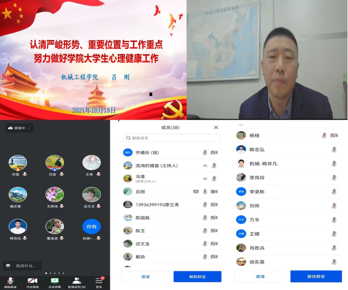10月18日下午,机械工程公司召开线上心理健康专项工作会议。公司党委书记吕刚,副书记徐东昊,全体辅导员和班主任参加了会议。会议由公司副处级辅导员、学工办主任毕强主持。