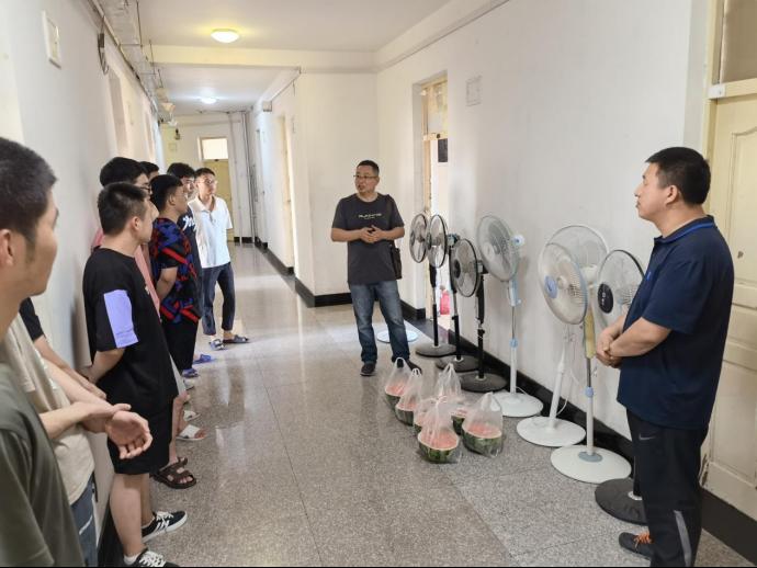 7月23日,ok138cn太阳集团529为响应学校暑期留校工作安排,保障留校学生的安全,为留校员工提供舒适的学习环境。公司党委副书记徐东昊、学工办主任毕强及辅导员韩志弘一行带着清凉的西瓜和学院各单位提供的风扇深入留校员工宿舍,看望留校员工。