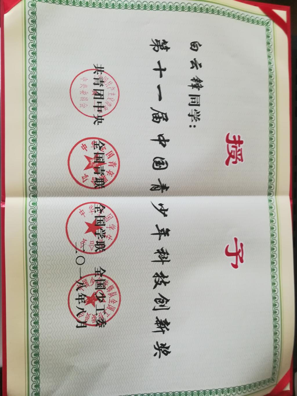公司ok138cn太阳集团529员工白云锋喜获第十一届中国青少年科技创新奖