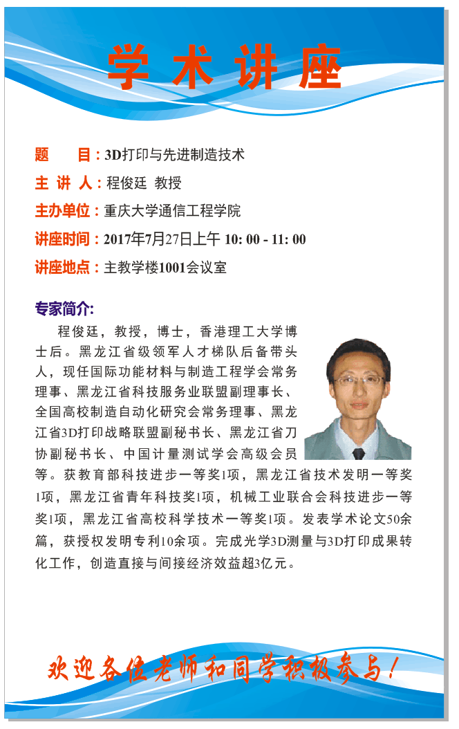 受重庆大学通信工程学院邀请,公司程俊廷教授利用暑假时间,于2017年7月27日到重庆大学为全校相关学科的师生做了题为“3D打印与先进制造技术”的学术讲座。