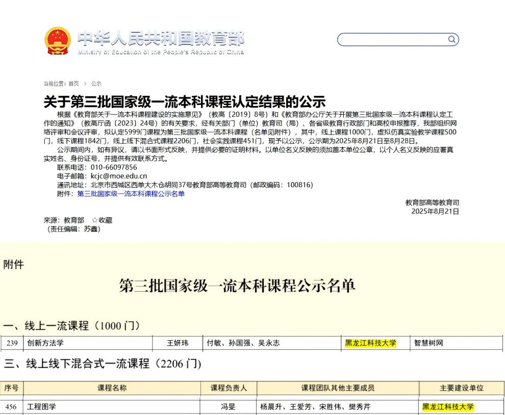 2025年8月21日,教育部高等教育司公布了《关于第三批国家级一流本科课程认定结果的公示》,公司机械基础教研室冯旻教授负责的《工程图学》课程入选国家级“线上线下混合式一流课程”,机电教研室王妍玮教授负责的《创新方法学》课程入选“线上一流课程”,标志着公司在课程建设征程中迈出了坚实的一步,彰显了公司持续推进课程建设与深化课程教学改革取得了明显成效。