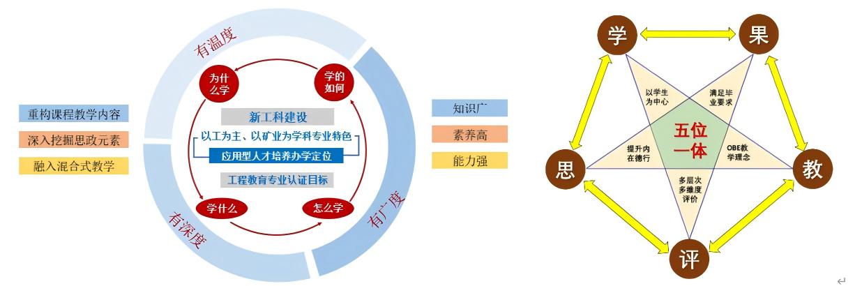 《工程图学》作为机械类及近机械类专业员工必修的技术基础课,面向机械类、材料类、自动化类、化工、采矿、环境等多个专业开设。课程立足公司以矿业特色鲜明的应用型人才培养办学定位,结合新工科建设、工程教育专业认证目标,以打造有温度、有深度、有广度的“三有”课堂为总体目标,构建了以员工为中心、关注毕业要求、钻研OBE教学理念、改革评价机制、融入思政元素的“学果教评思”五位一体教学模式。