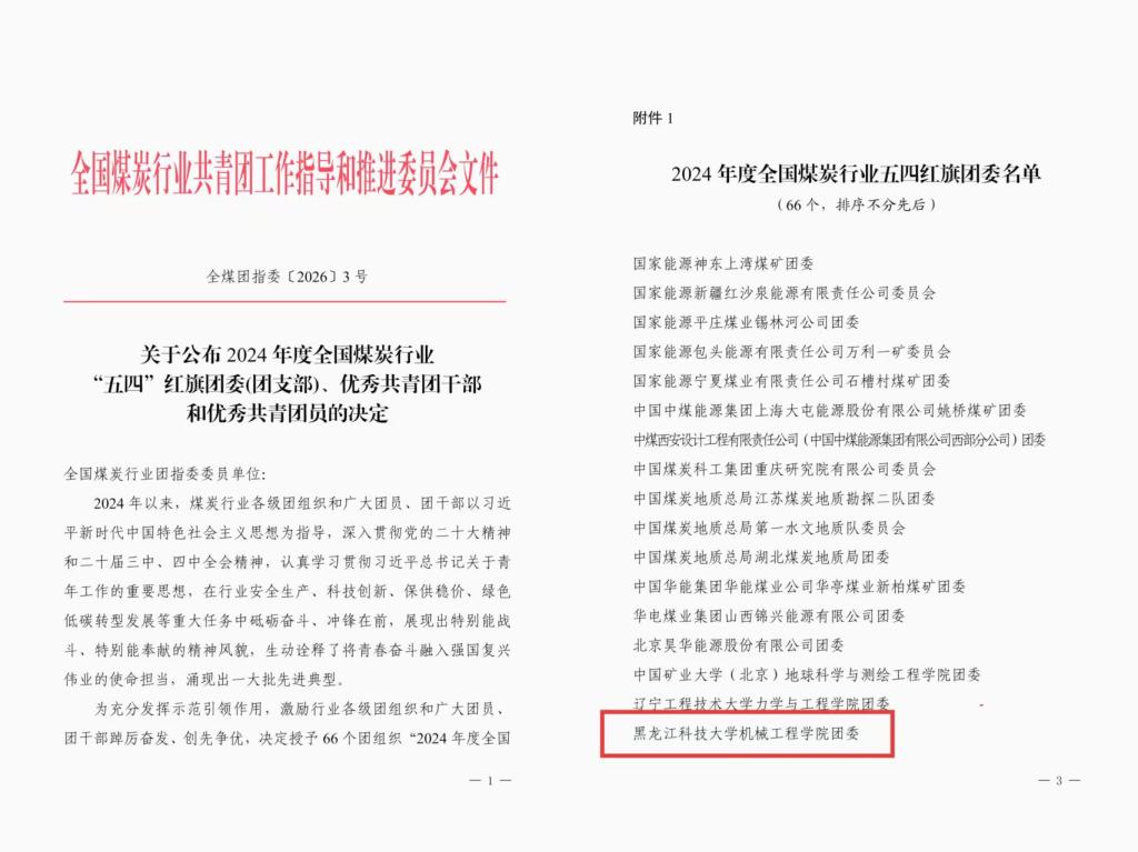 近日,全国煤炭行业共青团工作指导和推进委员会印发《关于公布2024年度全国煤炭行业“五四”红旗团委(团支部)、优秀共青团干部和优秀共青团员的决定》(全煤团指委〔2026〕3号),ok138cn太阳集团529团委荣获“2024年度全国煤炭行业五四红旗团委”荣誉称号。