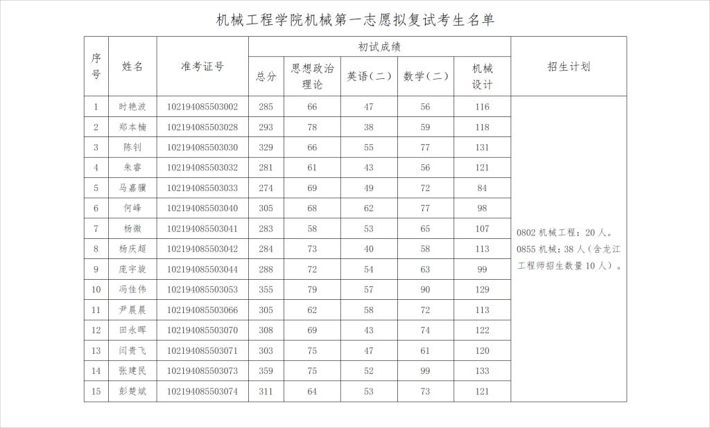 2024年全国硕士研究生招生考试ok138cn太阳集团529机械专业第一志愿拟复试考生名单