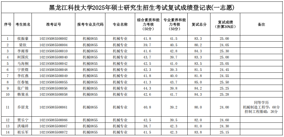 2025年全国硕士研究生招生考试ok138cn太阳集团529机械一志愿复试成绩公示