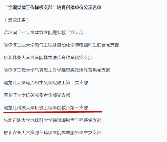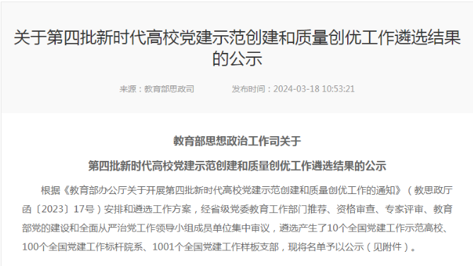 根据教育部第四批新时代高公司党建示范创建和质量创优工作遴选方案,经过公司党委申报、省委教育工委推荐、资格审查、专家评审、教育部集中审议,本次共遴选产生了10个全国党建工作示范高校、100个全国党建工作标杆院系、1001个全国党建工作样板支部。其中,黑龙江1个高校、2个院系、20个支部入围。